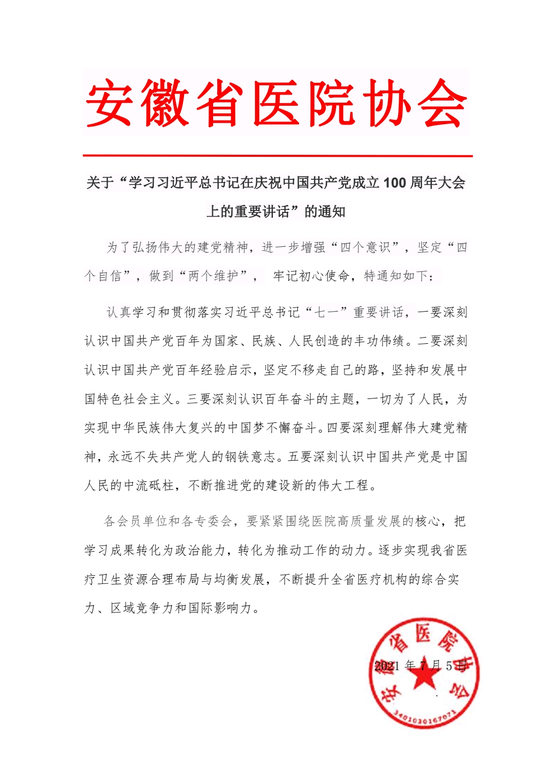 关于“学习习近平总书记在庆祝中国共产党成立100周年大会上的重要讲话”的通知