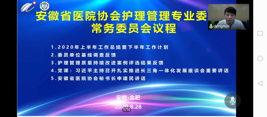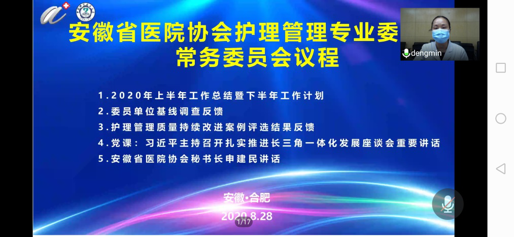 2020年8月28日上午,安徽省医院协会护理管理专业委员会第一届常委会在合肥顺利召开,安徽省医院协会秘书长申建民出席会议,会议由专委会副主任委员储爱琴主持。此次会议线上举办,专委会常委36人参加会议。