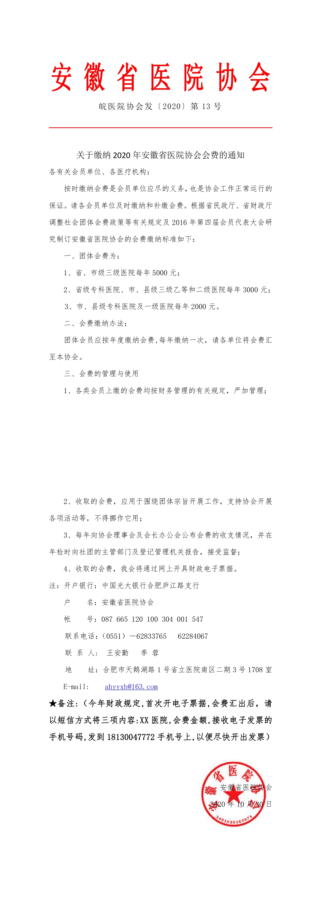 关于缴纳 2020 年安徽省医院协会会费的通知