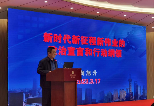 会议上,安徽省省直机关工委讲师团团长陶旭升以“新时代新征程新伟业的政治宣言和行动纲领”为主题进行党课教育。陶旭升团长为参会的各位代表介绍了二十大前在中共领导下过去五年的工作以及新时代十年的伟大变革,并仔细分析了本次二十大报告中的主要内容及重要提法,强调了中国共产党领导和中国特色社会主义制度的显著优势以及坚持党的领导、坚持发展中国特色社会主义的重要性。