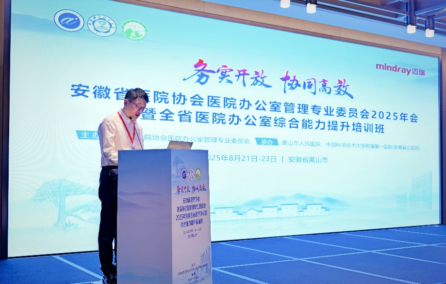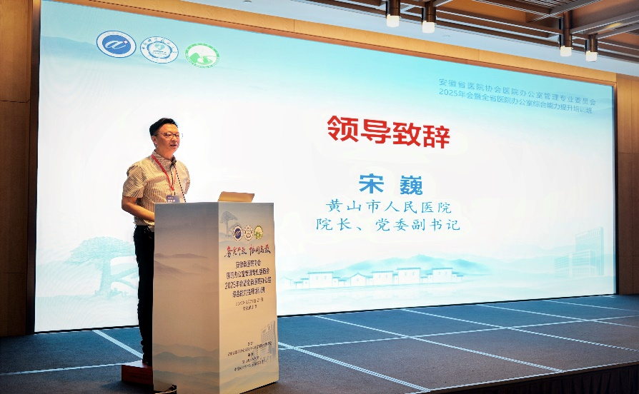 宋巍代表会议承办单位之一黄山市人民医院致欢迎辞, 他表示,希望全省医院办公室同仁以本次大会为契机,充分交流、互学互鉴,共同深入探讨现代医院办公室管理的新模式、新路径,推动全省医院办公室管理工作水平整体提升。