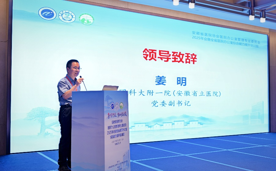 姜明代表会议承办单位之一中国科大附一院(安徽省立医院)致辞,他以“十五五”规划编制工作为切入点,对医院办公室提出要求,并希望与会人员踊跃交流、凝聚智慧,将会议成果切实转化为加强自身建设、推动医院高质量发展的实际行动,共同推动全省医院办公室工作再上新台阶。