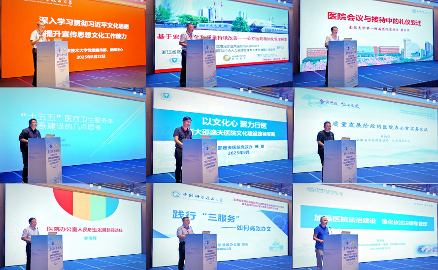 开幕式结束后,会议安排了内容丰富的专题讲座环节。邀请了中国科大党委常委、宣传部部长王伟、浙江大学医学院附属邵逸夫医院绍兴院区院长刘利民、南昌大学第一附属医院党政办主任康乐荣、安徽省中医药管理局中医药创新发展处处长陈鹏、浙江大学医学院附属邵逸夫医院党政办主任韩钢、安徽省中医药管理局综合处副处长杜鹏程、蚌埠医科大学第二附属医院党委书记李传辉、中国科学技术大学党政办副主任邵达、中国科大附一院(安徽省立医院)内科党总支书记兼党政办副主任宫志豪,先后围绕思想文化建设、精细化管理、办公室实务能力提升、规划编制、法治建设等方面,开展了九场主题鲜明、内涵丰富的专题讲座。